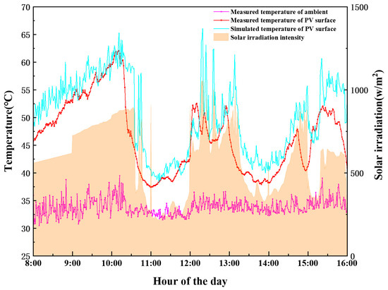 Errors between the measured and simulated values are inevitable. The mean absolute error (MAE) is defined as a quantity utilized to measure the closeness of the predicted values with the measured values. It is more suitable for analyzing situations where there are large fluctuations in the error and is used in this study to analyze the variation of PV module temperature over the course of a day, as shown in Figure 5. Figure 5 demonstrates the calculated and measured temperatures of the PV panels with reasonable consistency. While a few data points may not align perfectly at certain times, the overall MAE is 4.02 °C.