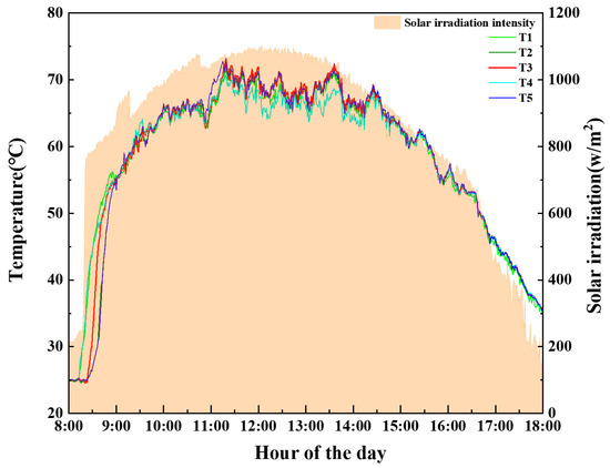 The surface temperature of PV panels increases with solar radiation, as expected. Specifically, the temperature distribution across the PV panels is uneven. Figure 6 displays the temperatures of five measurement points on the front side of the PV panel. Before 8:30 on D2, when solar irradiation changes drastically, the temperature difference on the panel can reach up to 16.50 °C. On the same PV panel, the temperatures at the upper measurement points (T1, T2) are slightly higher than those at the lower measurement points (T4, T5), with a temperature difference of less than 3.50 °C. These data indicate variations in temperature across the surface of the PV panel, highlighting an uneven temperature distribution. However, substantial temperature differences are not typical and may be influenced by factors such as shading or passing clouds.