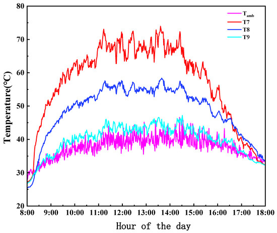 The PV modules are installed on traditional color steel tiles, which act as shading components that effectively reduce the roof temperature. Due to the material properties, metal roofs heat up rapidly under solar radiation, reaching temperatures as high as 73.95 °C without shading. Figure 7 illustrates the surface temperature of the metal roof with and without PV modules. Direct sunlight causes significant temperature fluctuations in the metal roof. Underneath the PV panels, the surface temperature of the metal roof decreases significantly, with the most pronounced effect observed around noon. The maximum cooling benefit can reach up to 29.25 °C with an average surface temperature reduction of 12.90 °C at the outlet of the air channel. Due to its location, the outlet (T9) temperature approximates the ambient temperature. Both temperature measurement points are situated within the air channel or beneath the metal roof, 200 mm from the inlet and outlet. However, the inlet temperature (T8) is generally higher than the outlet temperature (T9), varying from 1.07 to 15.02 °C. This phenomenon occurs because the inlet is oriented southward, exposing it to direct sunlight more frequently at the measurement point (Green-8) or transferring heat from other directly irradiated metal roof surfaces. Conversely, the measurement point (Green-9) has minimal exposure to direct sunlight, causing its temperature to be primarily influenced by the surrounding environment.
