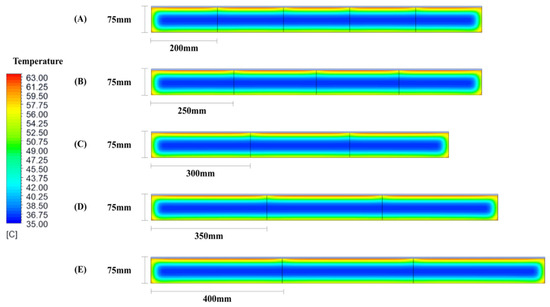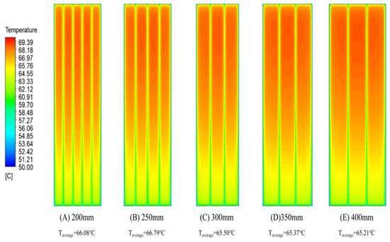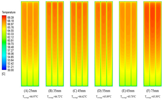 The impact of varying air channel dimensions on cooling efficiency reveals a gradual increase in heat dissipation as the air gap’s height (from 25 mm to 75 mm) and width (from 200 mm to 400 mm) increase. However, efficiency begins to decline when the height exceeds 65 mm. Among all 11 air channel configurations tested, the setup with dimensions of 75 mm × 400 mm achieves the lowest PV panel temperature at 65.21 °C, indicating the most effective cooling method with the highest temperature reduction. Compared to the smallest cooling space of 25 mm × 300 mm, this configuration shows an improvement of 1.76 °C in cooling performance. Further analysis of temperature contours depicted in Figure 8 and Figure 12 confirms a lower and more uniform temperature distribution across PV panels with larger cooling spaces.