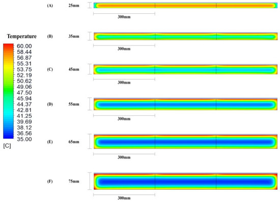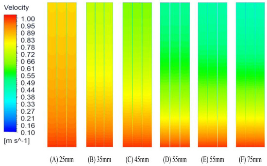 Figure 10, Figure 11, Figure 14 and Figure 15 display the air velocity and temperature contours at the outlets, illustrating both their magnitude and uniformity across the numerical values. The maximum temperatures are observed near the PV panels and the edges of the air channel. This phenomenon is particularly evident in Case A; however, similar contours appear when the heights exceed 55 mm, as seen in the results for 65 mm and 75 mm heights. In Case B, the widths noticeably impact the uniformity, with a significant decrease observed. Figure 14 and Figure 15 indicate that, apart from minor differences at extreme values, the velocity and temperature distribution remains consistent in Case B. This further confirms that height is more significant in heat dissipation efficiency.