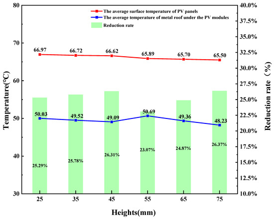 The simulated average surface temperatures of PV panels and roofs with varying heights are 25 mm, 35 mm, 45 mm, 55 mm, 65 mm, and 75 mm.