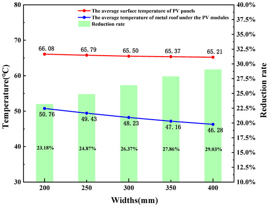 The simulated average surface temperature of PV panels and roofs with varying widths is 200 mm, 250 mm, 300 mm, 350 mm, and 400 mm.
