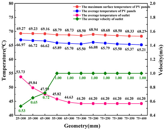 The simulated maximum and average surface temperature of PV panels, velocity, and average temperature at the outlet with all geometry.