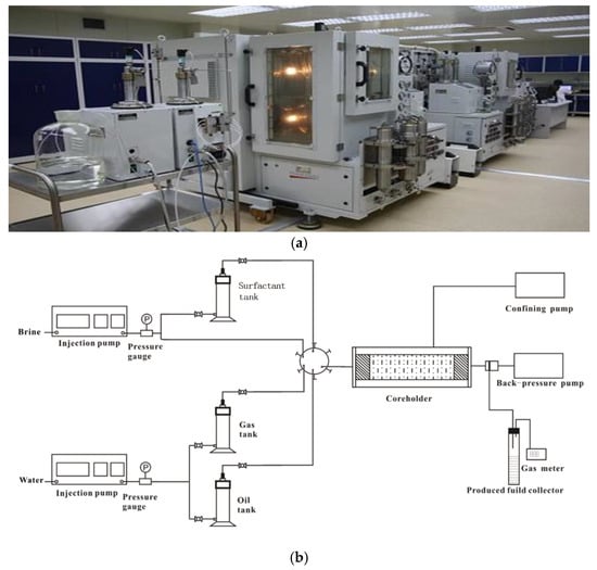 Core flooding apparatus. (a) High-temperature and high-pressure core flooding devices. (b) Schematic of core flooding apparatus.