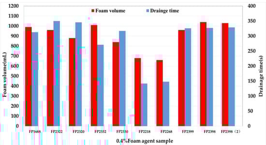 Under the condition of reservoir temperature of 40.0 °C and salinity of injected water of 7610.37 mg/L in the Mu146 block, the foaming property and stability of the foam flooding system are evaluated by the Warring stirring method. The self-developed foaming agents FP1688, FP2322, FP2320, FP2332, FP2330, FP2218, FP2268, FP2399, and FP2398 (The main compositions and type are presented in Table 1) are selected for compounding optimization with foam stabilizers WP308, WP100, WP2209, WP131, and WP2366 (The main compositions and type are presented in Table 2). The results are shown in Figure 2 and Figure 3 and Table 6.