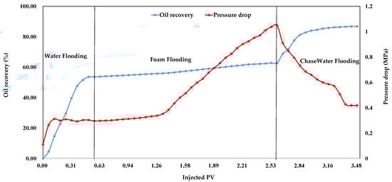 The results of the core flooding experiments are illustrated in Figure 4. The total oil recovery achieved through water flooding is 53.60%, as demonstrated by the pressure gradient and incremental oil recovery observed during foam injection. A robust foam is generated throughout the core, which effectively strips away residual oil trapped within the pores. When foam is formed, the hypertonic channel is blocked, and the injection pressure continues to rise. Furthermore, steady pressure is maintained during chase water flooding, indicating successful propagation of foam within the core’s pore structure, even under these conditions. Foam flooding results in an additional 33.20% incremental oil recovery compared to water flooding, bringing the total oil recovery to 86.80%. When the PV number is greater than 2.53, due to the continuous bursting of the foam, the sealing effect on the hyperosmotic channel is gradually weakened, and the injection pressure also decreases again. Consequently, it can be concluded that the foam formulation exhibited exceptional sweep efficiency, significantly enhancing overall oil recovery.
