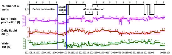 The validity period of the NSSNFHF field test is more than 12 months. Judging from the on-site sampling on 29 March 2024, the produced fluid was a khaki-colored emulsified oil liquid, which confirmed that the foaming agent has strong emulsifying ability. The NSSNFHP test has expanded the swept volume, mobilized the previously unswept oil-bearing areas, and played a “displacement” role in the adjacent wells of the oil well row (see Figure 7).