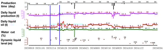 The comprehensive development curve of Well Mu146-61 is shown in Figure 6. The production of the Mu146-61 well group shows the characteristics of “three increases and one decrease”, with obvious oil production increase and a positive trend. Specifically, after the operation, the liquid production increased from 47.38 m3 to 82.70 m3, an increase of 74.55%. In February 2025, the water-cut ratio decreased from 97.64% to 96.46%, while daily oil production rose from 1.12 t to 2.92 t—an increase of 1.80 t (161%). Additionally, the flowing fluid level increased from −242 m to −220 m. For adjacent Well Mu128-64, following operations, daily liquid production escalated from 11.50 m3 to 17.54 m3; concurrently, the water cut reduced from 98.30% to 96.62%. Daily oil production for this well also saw an increase from 0.20 t to 0.60 t in February 2025—a rise of approximately 0.4 t (200%). The flowing fluid level experienced a decline from −83 m down to −266 m.