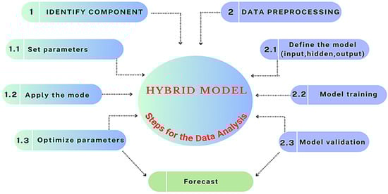 At many crucial stages, data analysis uses a hybrid model to estimate future cumulative gas production. The analysis begins with historical information on cumulative gas production and related variables, including reservoir pressure and cumulative water production, which is gathered over a set time, precisely 67 monthly dates over eight years. The dataset provides a cushion for the enhancement of deep learning, as large amounts of high-quality data are essential to create more accurate AI algorithms []. The forecasting system depends on this information. Secondly, data preparation is initiated through cleaning the dataset by employing outlier and missing value correction, thereby ensuring the integrity of the data. Moreover, data are standardized to ensure that all input data equally affect the model training process. The model architecture consists of input and output layers. After preprocessing, the dataset is divided into training and test sets, with 70–80% allocated for model training and 20–30% used for performance assessment. The hybrid model initialization is shown in Figure 2.