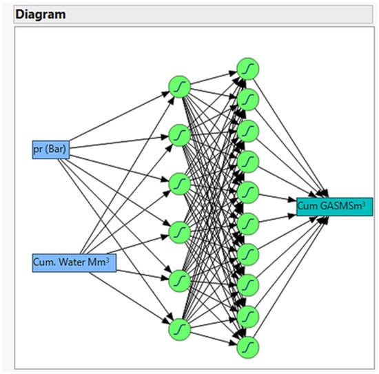 To predict Cumulative GAS MSm3 using an Artificial Neural Network (ANN) with Pr (Bar) and Cumulative Water (Mm3) as input features, the general equation for the ANN model can be represented in Equation (1):