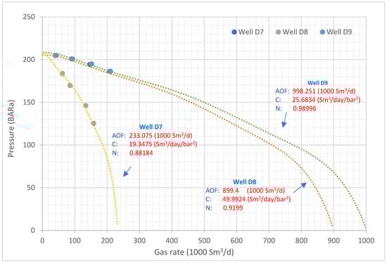 The IPR curve is to be generated in the program’s next step, which follows. Multiphase C and N models are chosen based on the available data. The recoveries arising during choke capacity measurements and the corresponding pressure values are defined in Table 2. The IPR curves were obtained in Figure 4 for wells D7, D8, and D9, respectively.