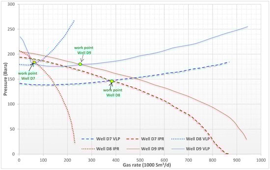 A quality check to the test data is achieved after excluding unfit tests and activating the best-fit one, modifying the reservoir pressure slightly based on the test to capture the actual flow behavior in the simulator. Then, the stable producing flow rate must be estimated under current conditions and set scenarios for future management. The intersection between the red IPR and the blue (VLP) indicated the possible gas rate for wells (7, 8, 9) under current conditions. The lift curves are then generated and prepared to be imported to Mbal. This step is of the utmost importance, as it serves as a connection between the reservoir and the production capabilities, examines the reservoir pressure, drive mechanism, and fluid behavior impacts on the flow rate, and thus limits overestimation during forecasting and addresses economic feasibility for long-term field planning.