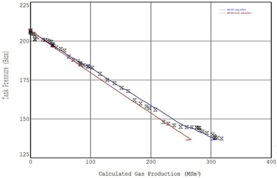 Water influx parameters are introduced to the program. This value determines how much water flows into the system as a result of a given pressure variation from the water body. Here, one can attribute the water body to the elements, and the required parameters can be set. In the first step, the program involves the definition of what model to use for the calculations. Throughout the interpretation of the material balance as a straight line, with the initial hydrocarbon in place, the water’s invasion into the hydrocarbon system and the original volume of the gas cap are estimated when compared to the hydrocarbon zone and the driving force []. The pre-evaluation of the initial reserve is essential and estimates the effect of water influx affinity into the reserve through a mathematical model matched to the field history. There have been numerous attempts to predict and evaluate the MBE, such as Van Everdingen and Hurst [] and Fetkovich []. The way Campbell’s plot works is by adapting the material balance equation to adapt the presence of the aquifer and its strength to find out whether it is weak, medium, or strong []. It also provides an insight into the presence of the aquifer. Building on the discussion of aquifer strength, further parameters should be introduced to capture the driving force. As the graphical method assumes a steady state or a semi-state, the revalidation of the data from the aquifer via regression is a prime factor in the simulation to recompensate the idealized conditions.