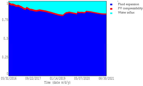 The pressure decline is steady, and during shutdown periods, stability is witnessed but no significant pressure rise is observed. This can also confirm the weak communication through the water influx. The communication and the effect of the aquifer varies from one well to another, and the reasons behind it are twofold. Firstly, geological formation effects, such as the depth of perforation intervals, formation fractures, and thin high permeability streaks, influence cumulative water production differently from one perforation zone to another. Secondly, mechanical consideration through a casing integrity test is required to be conducted. The dominance of the fluid expansion aligns the aquifer to a weak aquifer and provides minimal support. A discrepancy may arise between the energy plot and graphical method, and the possible reasons for this may be attributed to the fact that the aquifer model in the graphical method idealizes the conditions, and the energy plot depends on more precise details such as reservoir characteristics and production history. The delay in aquifer response is best demonstrated under the analytical method. However, the simplicity of detecting the major trend in the graphical method cannot be denied.