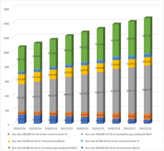 The objective of the production forecast was to determine the most feasible gas rate to produce under certain adjustments. The program defines certain constraints, which it considers in the calculation processes. Higher well capacity is required to evaluate maximum reservoir depletion. The manifold pressure is 28 Bara. Next, the well-type definition had to be completed by importing the tubing performance curve that was generated in the prosper program and setting a minimum value to the following bottom hole pressure to be 83 Bara. The history is available until mid-2022 with a tank pressure of 141 Bara cumulative gas production of 295.77 and a recovery of 36.7%. However, the production forecast starts at the beginning of 2021 until the end of the production. The reason for initiating a forecast at that date and leaving behind one year is to validate the simulator forecast. The field is currently considered a mature field and the active wells are declining. Execute the predication in two runs first, with the minimum value of the gas rate set at 50,000 Sm3/day (long-term production). The forecast results are illustrated in Figure 8. The second forecast is run with a maximum value of 100,000 Sm3/day (Short-term). A comparison between the two runs is illustrated in Figure 9.