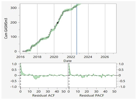 This study shows that the neural network model predicts cumulative gas production well. The model explains a lot of data variance, and the MAE (0.91) suggests that predictions are close to reality. SES and ANN help capture non-linear correlations in data, which is essential to effectively model gas reservoir behavior. Continuous cumulative gas production increases match the gas reservoirs’ natural increase, proving the model’s prediction ability. Forecasting the future production is shown in Figure 10; The upper graph illustrates in Figure 10 cumulative gas (cum GAS) over time, with black dots representing field data and green shading indicating software predictions. The blue vertical line marks the transition from observed data to forecasted values. The lower graph depicts the percentage error of these predictions. As the lines spread, they indicate greater uncertainties. The upper blue line represents the best-case scenario and the red one represents the worst-case scenario. However, as the forecast moves into the future, it loses its uncertainty.
