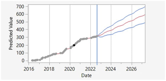 Data prediction calls for a characterization of the interaction between the actual and predicted variables. Determining the expected value is made possible by aggregating the values of several members and giving weights based on their membership condition. Numerical Equations (7) and (8) are often used in several disciplines to assess the accuracy of forecasts, evaluating the mean absolute error (MAE) and the root mean squared error (RMSE), respectively. Optimal models are selected depending on their capacity to forecast values with the lowest possible error.