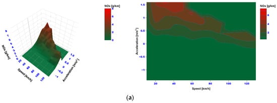 The interpolation function (5) [44] captured the interaction between vehicle dynamics and pollutant emissions, serving as the foundation for evaluating how changes in speed and acceleration influence environmental impact.
