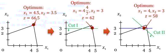 x2 = 3.5, the optimization problem-solving process might conclude with these non-integer optimal solution values. However, in ILP, where all decision variables are integers, the solution space must undergo slicing by the cutting plane. This operation can be conceptualized as the search for a scenario with integer values (