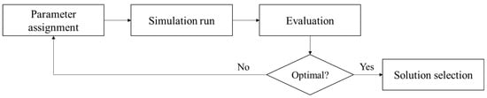 https://www.opttek.com/products/optquest/, accessed on 26 February 2025)) to concentrate on approximating solutions. Another approach involves developing a meta-model for a simulation model to facilitate optimization. By devising an abstract model for simulation as a formula, simulation execution time can be significantly reduced from 30,000 min to 300 min (5 h). However, abstracting a simulation to this extent also abstracts the solution space, making it less realistic and possibly leading to solutions that diverge from the original optimal solution. Despite this, as it is realistically unfeasible to allocate infinite time for optimal solution discovery in decision-making, applying a technique to find an approximate solution via simulation with the previously mentioned methodologies presents a viable alternative. Encouragingly, recent advancements in computer technology, the proliferation of high-performance computers, and the development of quantum computing are expected to enable researchers to more commonly conduct high-fidelity simulations to discover optimal solutions.