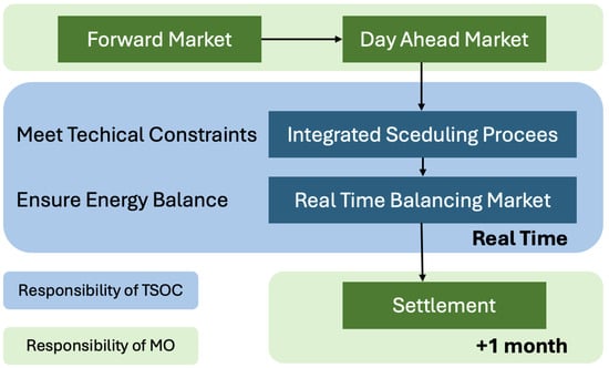 The forward market enables market participants to secure long-term contracts for electricity delivery, offering price stability and risk management. The day-ahead market operates as a centralized platform where participants submit their bids and offers for electricity one day before actual delivery, facilitating an optimized and cost-effective generation schedule. These markets are under the jurisdiction of the MO, which is responsible for ensuring transparent and equitable market operations. In the subsequent layers, operational activities transition to the responsibility of the TSOC. The Integrated Scheduling Process is a critical mechanism managed by the TSOC to ensure the technical feasibility of the schedules generated in the day-ahead market. This process validates that the planned generation and consumption schedules comply with technical constraints, such as grid stability and reliability requirements. Additionally, the TSOC oversees the real-time balancing market, which operates in real time to address any discrepancies between scheduled and actual electricity generation and demand. This market is crucial for maintaining the energy balance and ensuring the secure operation of the power system. The final stage in the sequence is the Settlement Process, which reconciles financial transactions among market participants based on actual market outcomes. This process occurs approximately one month after the delivery of electricity and is under the MO’s responsibility. Settlement ensures that all parties are compensated fairly, considering the deviations and balancing actions undertaken in real-time operations.