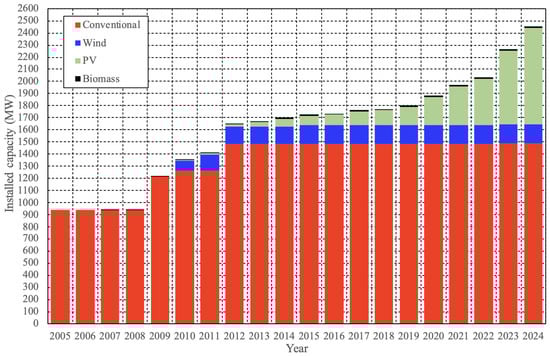 By 2024, in terms of nominal generation capacity, as shown in Figure 3, PV technology accounts for a substantial share of total installed capacity, with wind energy maintaining a steady presence. Biomass remains a minor contributor, while conventional generation capacity has remained relatively stable in recent years.