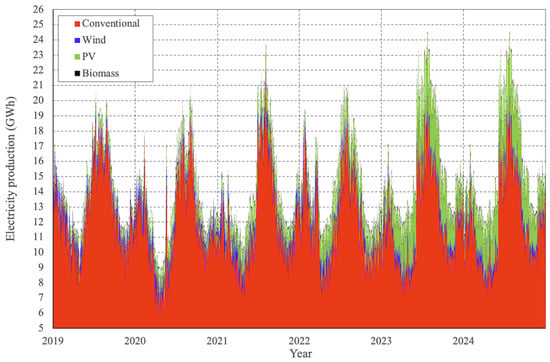 In regard to the electricity generation profile, a distinct pattern emerges where electricity generation reaches its highest levels during the summer months, coinciding with increased cooling demand due to high temperatures. As shown in Figure 4, these peak demand periods are evident in mid-2019, mid-2020, mid-2021, and mid-2022, with electricity generation frequently exceeding 20 GWh per day. During these peaks, the contribution of PV generation becomes more pronounced, particularly during mid-day hours when solar irradiance is at its highest. However, conventional generation continues to dominate, highlighting the reliance on fossil fuels for meeting peak demand. Conversely, during the winter months, electricity demand tends to be lower, except for brief spikes during cold weather events that increase heating loads. These off-peak periods, especially in late 2019, early 2020, early 2021, and early 2022, show a reduction in overall electricity production, often stabilizing around 10–12 GWh per day. During these times, PV generation is significantly lower due to reduced sunlight availability, and wind power shows intermittent behavior depending on weather conditions. Biomass remains a minor but stable contributor throughout the period.