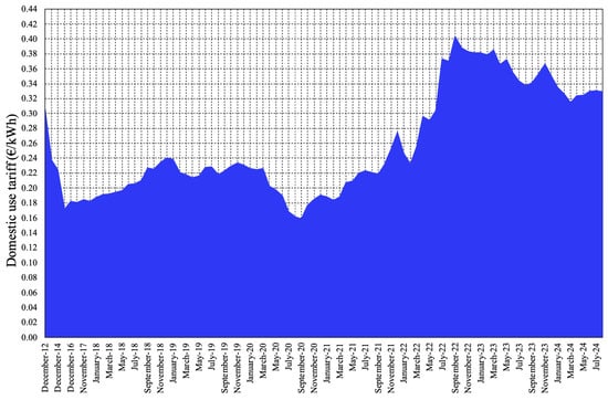 The geopolitical conflict resulting from the war in Ukraine has had far-reaching implications for the global energy landscape, significantly influencing energy security policies and diversification strategies. For Cyprus, the crisis underscored vulnerabilities linked to its reliance on oil and the impact of carbon pricing on electricity costs. In Cyprus, the relatively high carbon intensity of the electricity sector, owing to its historical reliance on heavy fuel oil and diesel, has translated into significant cost increases under the ETS. These costs are typically passed on to consumers, resulting in heightened electricity price volatility. The evolution of residential electricity prices in Cyprus over time, including value-added tax (VAT) and contributions to the renewable energy sources (RESs) and energy conservation fund, is presented in Figure 5. The trend reveals significant price fluctuations, shaped by demand conditions, regulatory policies, and external geopolitical and economic factors. In the earlier years, electricity prices exhibit relative stability, with a slight decline followed by a gradual increase, reflecting moderate fuel price variations and incremental changes in policy-driven charges. From 2016 to early 2020, prices remained relatively stable, with minor fluctuations. However, a notable drop in prices occurred during 2020, coinciding with the COVID-19 pandemic, which led to a global decrease in energy demand and significant reductions in fuel prices. This period of lower electricity costs reflects the economic slowdown and lower energy consumption due to lockdown measures. Post-pandemic, from mid-2021 onward, electricity prices began to increase sharply, aligning with the global energy crisis triggered by the war in Ukraine that led to supply chain disruptions. This upward trajectory peaked in 2022, when prices reached their highest recorded levels, exceeding 0.40 €/kWh. Following the peak in 2022, electricity prices began to stabilize and slightly decline throughout 2023 and 2024, mirroring the moderation of fuel costs in global markets. Despite this decrease, prices remain substantially higher than pre-2020 levels, suggesting that structural factors, such as Cyprus’ dependence on imported fossil fuels and ongoing investments in the energy transition, continue to exert upward pressure on electricity tariffs.