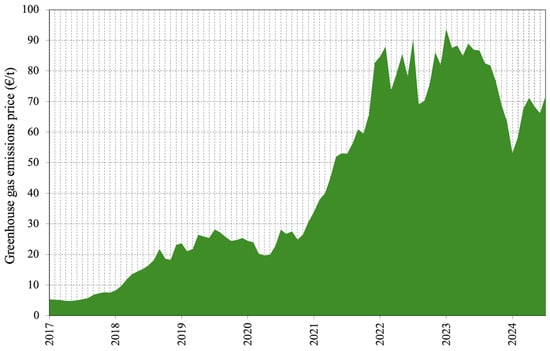 It should be noted that while the war in Ukraine caused sharp increases in the prices of natural gas and oil globally, its effects on Cyprus primarily stemmed from rising carbon prices, given the country’s reliance on oil and RESs rather than natural gas. These cost pressures translated into higher electricity bills for consumers and businesses, reinforcing the urgency of reducing dependency on carbon-intensive energy sources. The evolution of CO2 prices from 2017 to 2024 is illustrated in Figure 6. A key observation from the figure is the growing significance of CO2 prices, particularly after 2018, when carbon pricing began to escalate due to more stringent EU climate policies. Initially, CO2 costs represented a smaller share of the total electricity cost structure; however, by 2021–2022, they became a dominant component, reaching their peak in mid-2022. This increase aligns with the EU’s commitment to reducing greenhouse gas emissions, leading to higher CO2 prices, which have significantly impacted electricity generation costs in Cyprus, given its reliance on carbon-intensive fossil fuels.