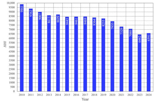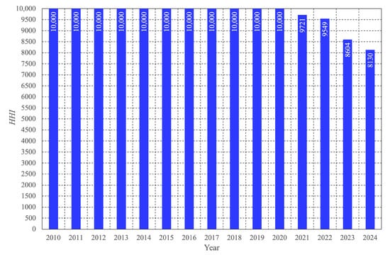 The Herfindahl–Hirschman Index (HHI) [43] is a commonly used metric for measuring market concentration that is calculated by summing the squares of market shares of all firms in the market: