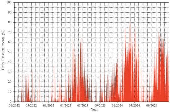 The daily PV curtailment percentage over the period from 2022 to 2024 is presented in Figure 9. A clear seasonal pattern emerges, with peak curtailments occurring primarily during the autumn and spring months. These periods are characterized by moderate temperatures, resulting in lower electricity consumption due to reduced heating and cooling demand. Consequently, the electricity system experiences an oversupply of solar energy during midday hours, leading to significant curtailment events. In contrast, during the winter months, curtailment levels are relatively lower as heating demand increases electricity consumption, allowing for a greater share of PV generation to be absorbed. Similarly, in the summer months, although solar generation is at its highest, higher electricity demand due to air conditioning usage helps mitigate extreme curtailments. The data also reveal a pronounced increase in PV curtailments in recent years, particularly in 2023 and 2024, as the share of installed PV capacity continues to grow. The rising frequency and magnitude of curtailment events, with instances exceeding 60%, indicate that grid constraints and the lack of sufficient flexibility measures—such as energy storage, demand response, and market-driven solutions—are preventing the full utilization of solar energy. This trend underscores the necessity for strategic interventions, including grid reinforcement, advanced forecasting techniques, and regulatory incentives for flexibility services. Without these measures, the increasing levels of PV curtailments could undermine the economic viability of renewable investments and hinder Cyprus’ broader energy transition objectives. Addressing these challenges is essential to ensure efficient solar energy integration and to support the decarbonization of the power sector.