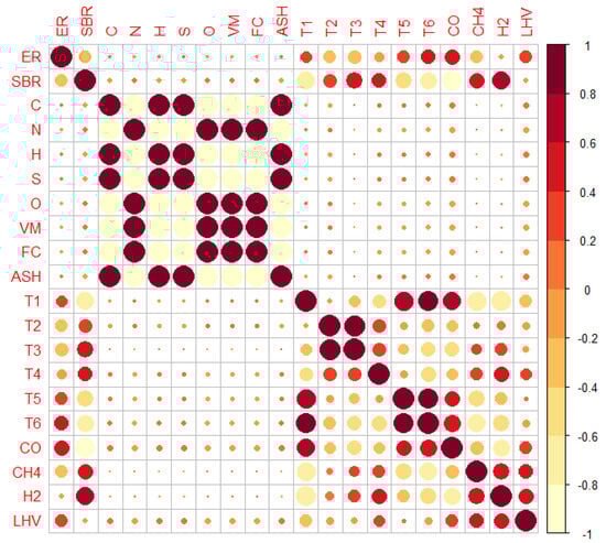 Spearman correlation analysis (Figure 4) was employed to explore the preliminary relationships between various variables within the gasification process. This non-parametric method assesses the direction and strength of associations between two variables by ranking their values and applying a monotonic function. The resulting correlation coefficient ranges from −1 to +1, where +1 indicates a perfect positive correlation, 0 denotes no correlation, and −1 signifies a perfect negative correlation. Unlike other correlations, Spearman correlation does not assume that the data are normally distributed. This makes it suitable for data that do not meet the normality assumption, which is common in real-world scenarios.
