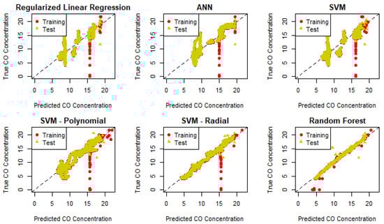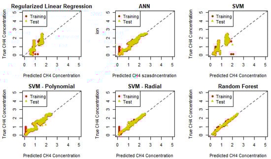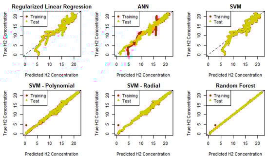 The machine learning algorithms employed in this study include regularized regression, artificial neural networks (ANNs), support vector machines (SVMs), SVMs with polynomial and radial kernels, and random forest (RF). These algorithms were used to develop predictive models for the composition of syngas and its lower heating value (LHV) based on the features outlined in Section 3.1. Table 2 shows the performance of the proposed models in predicting the output variables.