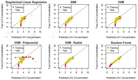 Table 2 reveals that all the employed models demonstrated robust performance, with the exceptions of linear regression, regularized linear regression, and support vector regression (SVR) with linear kernels. This observation is in line with the intrinsic characteristics of the gasification process, which is highly heterogeneous and non-linear. Such processes involve complex interactions among variables like fuel type, gasifying agent, and fuel-to-air ratio, which significantly influence the syngas composition and its lower heating value (LHV). Linear models are inherently limited in terms of capturing these complex interactions due to their straightforward mathematical nature.
