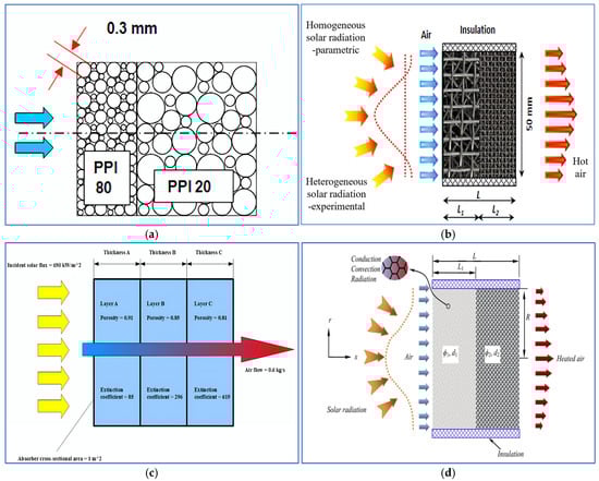 Due to these advantages, PSRs hold significant promise for high-temperature solar thermal applications, including solar-driven power generation [11,12], thermochemical fuel production, and industrial process heat. Their ability to efficiently absorb and transfer solar energy makes them particularly suitable for concentrated solar power (CSP) systems [13,14], where maximizing thermal efficiency is crucial. Additionally, the high thermal stability and durability of porous structures enable their integration into next-generation solar reactors for hydrogen production, solar metallurgy, and waste heat recovery.