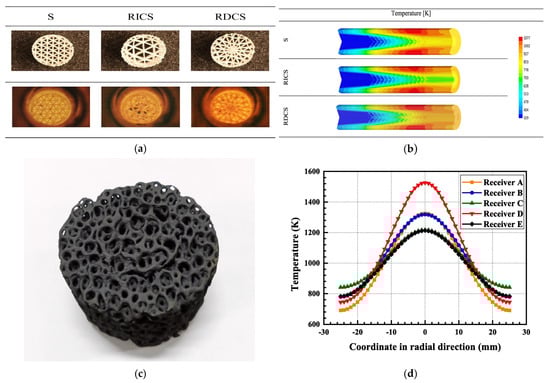 Du et al. [26] fabricated a radially graded porous volumetric solar receiver via X-ray tomography and 3D printing and optimized the pore size distribution with a genetic algorithm, as seen in Figure 2c. Radiation heat transfer was calculated using the Rosseland approximation. Figure 2d shows that a radially graded pore diameter configuration effectively adjusts the mass flow distribution, aligns with non-uniform solar radiation, and mitigates local overheating.