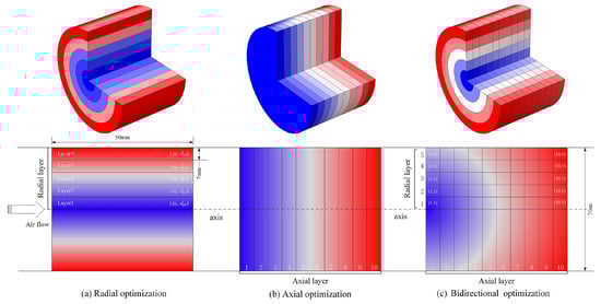 The third strategy is the bidirectional configuration, where the pore parameters vary synchronously along the radial and axial directions. Therefore, the comprehensive flow and heat transfer performance could be enhanced more thoroughly than the one-direction method.