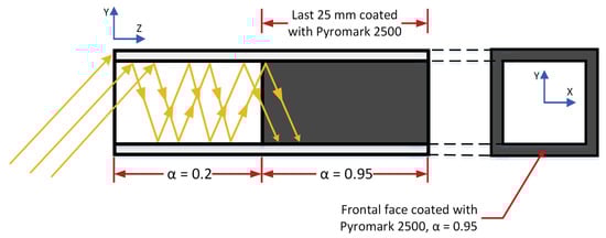 Ali et al. [32] introduced a honeycomb solar receiver design with varying absorption rates, as shown in Figure 4. The first segment coats a high-reflection layer (absorption rate of 0.2), and the second coats a high-absorption layer (absorption rate of 0.95). The energy flux distribution was calculated using Monte Carlo ray tracing and then converted into a volumetric heat source for the numerical model. The results indicate that surface coatings controlling the absorption of radiative flux inside the honeycomb receiver can achieve positive volumetric effects and high thermal efficiency.