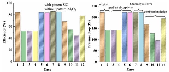 Chen et al. [34] employed pore-scale direct 3D modeling to calculate the energy conversion efficiency of silicon carbide and alumina ceramic foam solar absorbers. Figure 5 compares the thermal efficiency of various porous materials with different optical properties, such as gradient surface absorption, spectral selectivity, and the combination of opaque porous structures with transparent front-end layers. The results show that spectrally selective coatings are superior designs for enhancing the solar-to-thermal energy conversion efficiency.