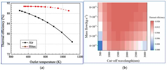 He et al. [36] conducted pore-scale simulations to analyze how spectral selectivity affects the thermal performance of porous volumetric solar receivers. They optimized the cut-off wavelength to achieve a balance between energy losses in the porous structure and the fluid. The findings indicate that the heat transfer fluid’s cut-off wavelength plays a crucial role in thermal efficiency. At a mass flow rate of 4 × 10−5 kg/s, altering the wavelength from 500 nm to 2500 nm leads to a 3.8% variation in efficiency. However, considering the fluid’s optical properties results in a 2.77% reduction in thermal efficiency, as illustrated in Figure 6b.