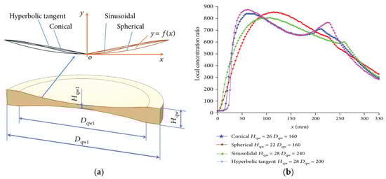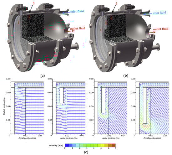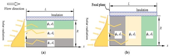 Schematic of the thermochemical reactor heated by concentrated solar radiation [44]. (a) Gradual design in the radial direction; (b) gradual design in the axial direction.