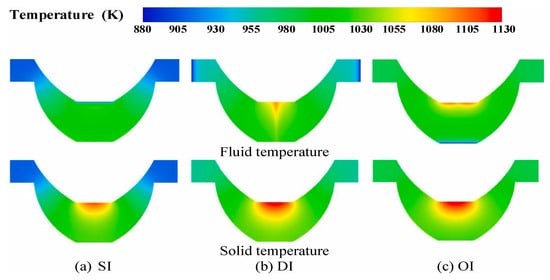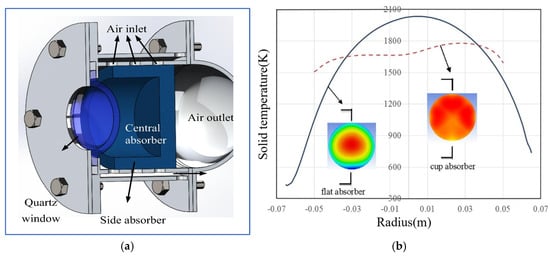 Meng [52] designed a closed cup-shaped porous volumetric absorber, as shown in Figure 11a. The energy flux distribution between the optical window and absorber core was modeled using MCM. The temperature field of the absorber was solved using an LTNE model and the Rosseland approximation. In Figure 11b, the results indicated that although the optical window increased the reflection losses of concentrated sunlight, the peak temperature of the porous skeleton rose by 213 K, reducing infrared radiation losses. Furthermore, accounting for internal radiation transfer within the cavity reduced the temperature difference of the solid to 700 K, leading to a more uniform temperature distribution.