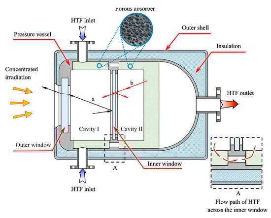 - Wang, F.; Shuai, Y.; Tan, H.; Yu, C. Thermal performance analysis of porous media receiver with concentrated solar irradiation. Int. J. Heat Mass Transf. 2013, 62, 247–254. [Google Scholar] [CrossRef]