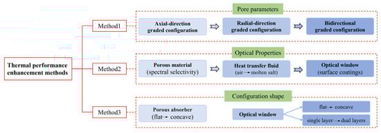 The optimization strategies for enhancing the flow and heat transfer performance of the PSR can be classified into three primary approaches, each focusing on different aspects of the receiver’s thermal and optical behavior. The first strategy is to adjust the porosity parameters (pore size or porosity) of the porous medium to strengthen its volumetric effect, which plays a crucial role in improving the receiver’s ability to absorb and transfer heat.