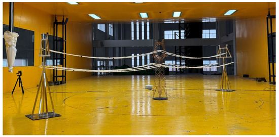 The prototype of the experimental model adopts the transmission tower line system of the 200 kV transmission line in Xinjiang, as shown in Figure 1. The transmission tower is a lattice style cat head tower, with a height of 29.9 m and a nominal height of 21 m, as shown in Figure 2. The horizontal span is 400 m, and the conductor sag is 9.68 m. The wire is divided into three phases, with the phase lines on both sides arranged horizontally and suspended on the cantilever of the tower through insulators. The intermediate phase line is suspended in the middle of the locomotive through insulators. Each phase is equipped with 2XJL/G1A-400/35 wires, with a split spacing of 200 mm and I-shaped gaskets. According to the similarity theory, an aeroelastic model was created, as shown in Figure 3. In the model design of tower line systems, not only must the structure and all components strictly meet geometric similarity, but the most important parameters, such as Strouhal number, Froude number, elastic parameters (Cauchy number), inertial parameters (mass parameters), damping ratio, etc., must also strictly meet similarity. The similarity of Reynolds numbers is clearly unsatisfactory.