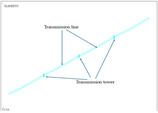 In order to test the frequencies and the damping ratio of the model, before the wind-tunnel test, the dynamic characteristics of the aeroelastic model of the tower and lines are calculated by ANSYS 19.1 (Figure 5). As a highly flexible structure, the guide (ground) wire mainly bears tensile force, and its compressive and bending bearing capacity can be basically ignored. This article uses the three-dimensional pole element LINK10 to simulate transmission lines, which can achieve structural nonlinearity, stress stiffening, large deformation and other characteristics. By using keyopt (3) = 0 to set the unit to only be in tension, wire relaxation can be simulated when the wire loses tension. When conducting finite element modeling, in order to obtain sufficient accuracy and ensure model calculation efficiency, it is necessary to divide the suspension cable into a sufficient number of elements and concentrate the load on the nodes at both ends of the elements. Therefore, it is chosen to set up a unit every 10 m when dividing the transmission line units. The frequencies of the model are shown in Table 3 and Table 4.