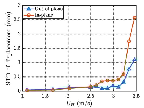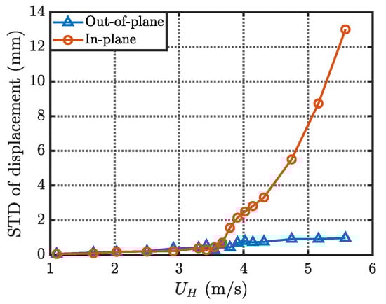 Figure 9 shows the variation of the STDs of the midspan displacements of the conductor lines with wind speed at wind direction α = 0°. It is shown that the galloping initiation wind speed is 3.8 m/s, and the vibration is dominated by the in-plane galloping. Figure 10 shows the displacement time histories of the midspan of conductor. At a wind speed of 1.1 m/s, the vibration of conductor is stochastic and is dominated by buffeting vibration in both in-plane and out-of-plane directions. At a wind speed of 5.58 m/s, the galloping vibration occurs, and the displacements show obvious narrow-band characteristics, especially in in-plane direction. It should be noted that the static displacement caused by wind has been eliminated in the response.