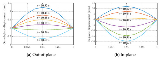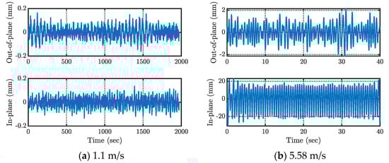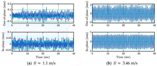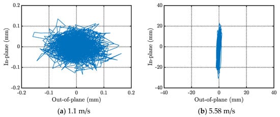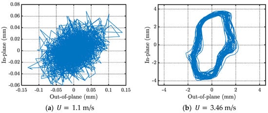 Figure 11 shows the trajectory of the midspan of conductor. At a wind speed of 1.1 m/s, the in-plane and out-of-plane displacements are comparable and show little correlation between them. At a wind speed of 5.58 m/s, the galloping vibration occurs and is dominated in the in-plane direction, thus, the shape of the trajectory is a very flattened ellipse.