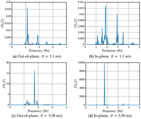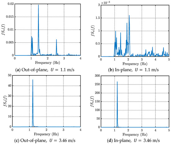 PSDs of accelerations of tower ( 1.1 m/s, ).